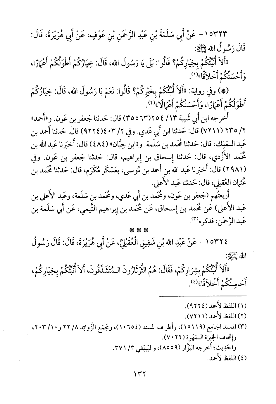 (¬٣) المسند الجامع (١٥١١٩)، وأطراف المسند (١٠٦٥٤)، ومَجمَع الزوائد ٨/ ٢٢ و ١٠/ ٢٠٣، وإتحاف الخِيرَة المَهَرة (٧٠٢٢).