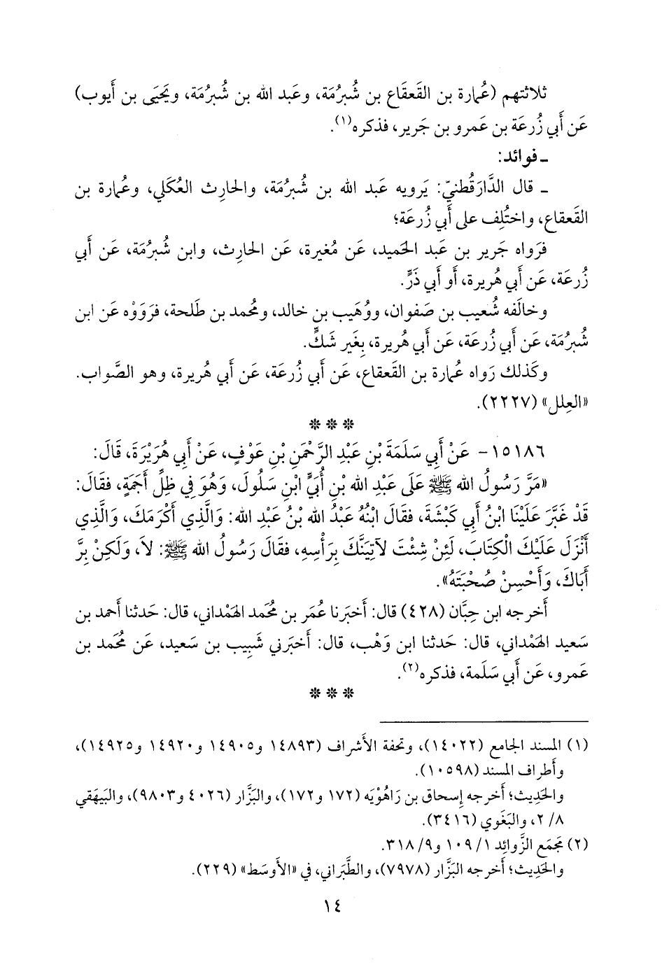 - قال الدارقُطني: يرويه عبد الله بن شبرمة، والحارث العُكلي، وعمارة بن القعقاع، واختلف على أَبي زُرعَة؛