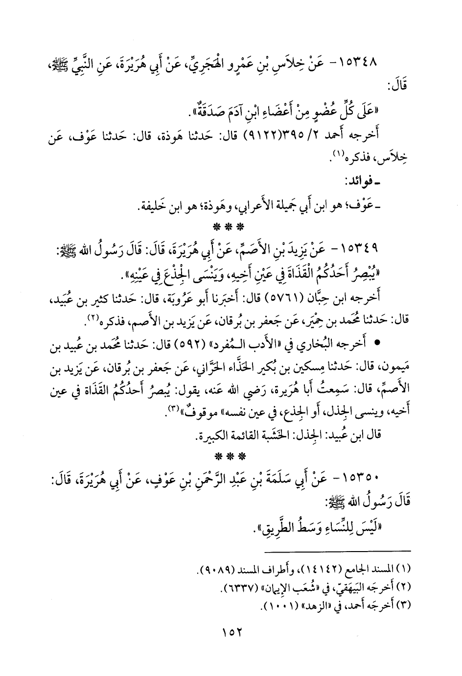 • أَخرجه البخاري في «الأدب المفرد» (٥٩٢) قال: حدثنا محمد بن عبيد بن ميمون، قال: حدثنا مسكين بن بكير الحذاء الحراني، عن جعفر بن برقان، عن يزيد بن الأصم، قال: سمعت أبا هريرة، رضي الله عنه، يقول: يبصر أحدكم القذاة في عين أخيه، وينسى الجذل، أو الجذع، في عين نفسه» موقوف» (¬٢).