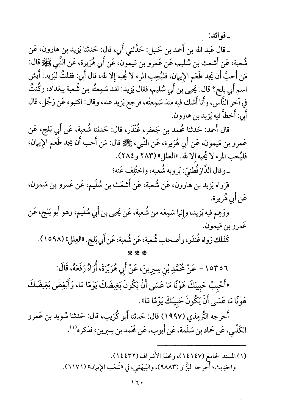 قال أحمد: حدثنا محمد بن جعفر غُندَر، قال: حدثنا شعبة، عن أبي بَلْج، عن عَمرو بن ميمون، عن أبي هريرة، عن النبي، صَلى الله عَليه وسَلم قال: من أحب أن يجد طعم الإيمان، فليحب المرء لا يحبه إلا لله. «العلل» (٢٨٣ و ٢٨٤).
