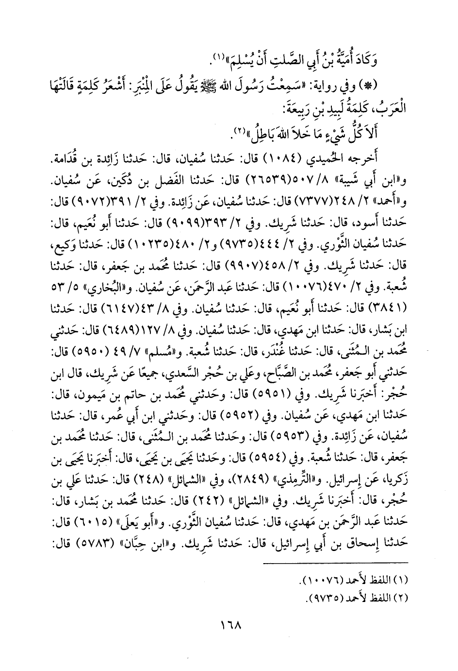وفي ٢/ ٤٤٤ (٩٧٣٥) و ٢/ ٤٨٠ (١٠٢٣٥) قال: حدثنا وكيع، قال: حدثنا شَريك. وفي ٢/ ٤٥٨ (٩٩٠٧) قال: حدثنا محمد بن جعفر، قال: حدثنا شعبة. وفي ٢/ ٤٧٠ (١٠٠٧٦) قال: حدثنا عبد الرَّحمَن، عن سفيان. و «البخاري» ٥/ ٥٣ (٣٨٤١) قال: حدثنا أَبو نُعيم، قال: حدثنا سفيان. وفي ٨/ ٤٣ (٦١٤٧) قال: حدثنا ابن بشار، قال: حدثنا ابن مهدي، قال: حدثنا سفيان. وفي ٨/ ١٢٧ (٦٤٨٩) قال: حدثني محمد بن المثنى، قال: حدثنا غُندَر، قال: حدثنا شعبة. و «مسلم» ٧/ ٤٩ (٥٩٥٠) قال: حدثني أَبو جعفر، محمد بن الصباح، وعلي بن حُجْر السعدي، جميعا عن شريك، قال ابن حجر: أخبرنا شريك. وفي (٥٩٥١) قال: وحدثني محمد بن حاتم بن ميمون، قال: حدثنا ابن مهدي، عن سفيان. وفي (٥٩٥٢) قال: وحدثني ابن أبي عمر، قال: حدثنا سفيان، عن زائدة. وفي (٥٩٥٣) قال: وحدثنا محمد بن المثنى، قال: حدثنا محمد بن جعفر، قال: حدثنا شعبة. وفي (٥٩٥٤) قال: وحدثنا يحيى بن يحيى، قال: أخبرنا يحيى بن زكريا، عن إسرائيل. و «التِّرمِذي» (٢٨٤٩)، وفي «الشمائل» (٢٤٨) قال: حدثنا علي بن حُجْر، قال: أخبرنا شريك. وفي «الشمائل» (٢٤٢) قال: حدثنا محمد بن بشار، قال: حدثنا عبد الرَّحمَن بن مهدي، قال: حدثنا سفيان الثوري. و «أَبو يَعلى» (٦٠١٥) قال: حدثنا إسحاق بن أبي إسرائيل، قال: حدثنا شَريك. و «ابن حِبَّان» (٥٧٨٣) قال: