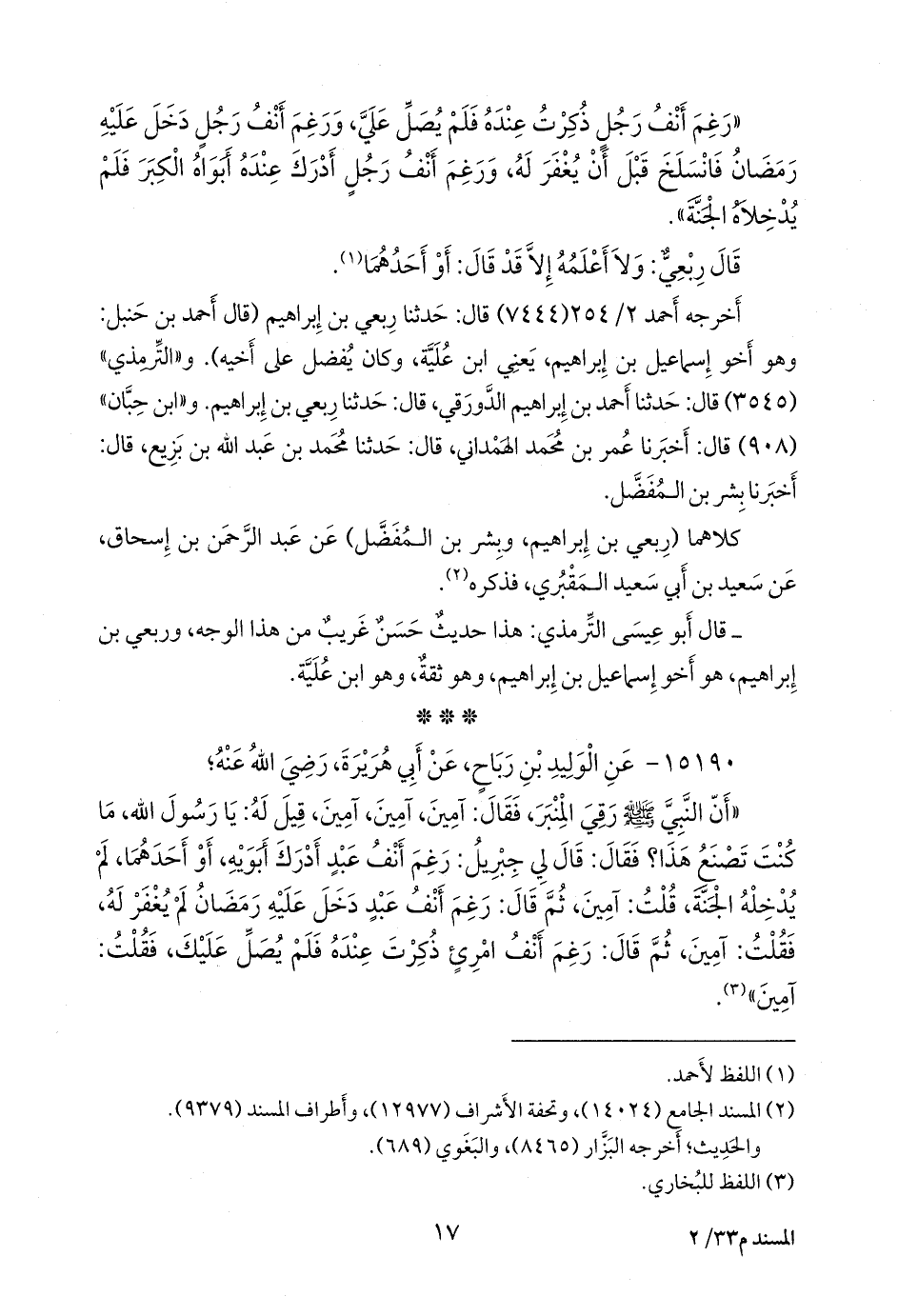 «أن النبي صَلى الله عَليه وسَلم رقي المنبر، فقال: آمين، آمين، آمين، قيل له: يا رسول الله، ما كنت تصنع هذا؟ فقال: قال لي جبريل: رغم أنف عبد أدرك أَبويه، أو أحدهما، لم يدخله الجنة، قلت: آمين، ثم قال: رغم أنف عبد دخل عليه رمضان لم يغفر له، فقلت: آمين، ثم قال: رغم أنف امرئ ذكرت عنده فلم يصل عليك، فقلت: آمين» (¬١).