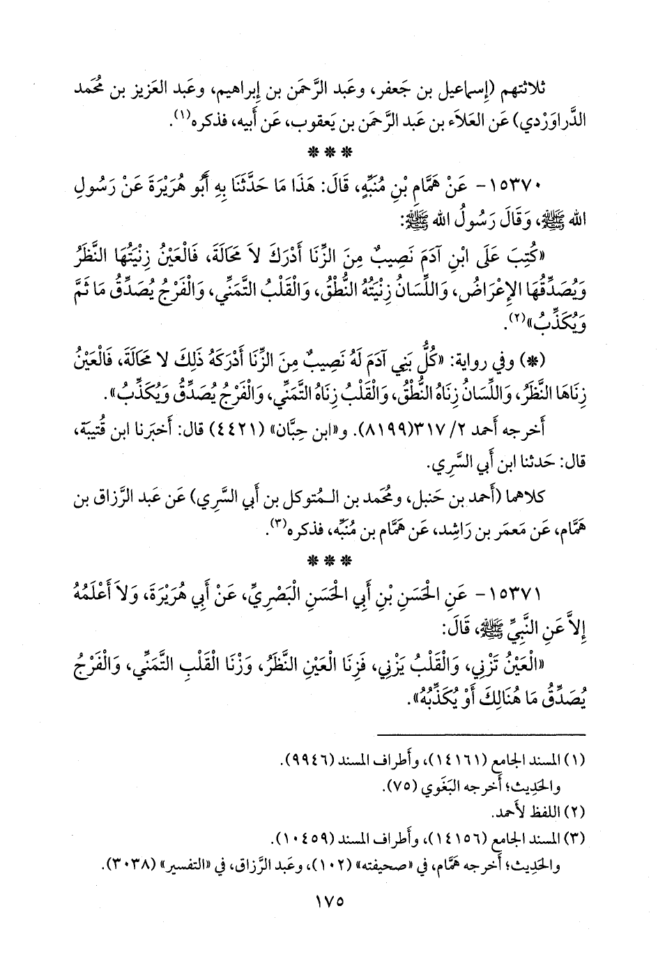 - وفي رواية: «كل بني آدم له نصيب من الزنا أدركه ذلك لا محالة، فالعين زناها النظر، واللسان زناه النطق، والقلب زناه التمني، والفرج يصدق ويكذب».
