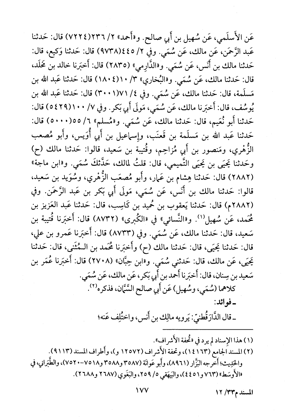 و «مسلم» ٦/ ٥٥ (٥٠٠٠) قال: حدثنا عبد الله بن مَسلَمة بن قعنب، وإسماعيل بن أبي أويس، وأَبو مصعب الزُّهْري، ومنصور بن أبي مزاحم، وقتيبة بن سعيد، قالوا: حدثنا مالك (ح) وحدثنا يحيى بن يحيى التميمي، قال: قلت لمالك، حدثك سمي. و «ابن ماجة» (٢٨٨٢) قال: حدثنا هشام بن عمار، وأَبو مصعب الزُّهْري، وسويد بن سعيد، قالوا: حدثنا مالك بن أنس، عن سمي مولى أَبي بكر بن عبد الرَّحمَن. وفي (٢٨٨٢ م) قال: حدثنا يعقوب بن حميد بن كاسب، قال: حدثنا عبد العزيز بن محمد، عن سهيل (¬١). و «النَّسَائي» في «الكبرى» (٨٧٣٢) قال: أخبرنا قتيبة بن سعيد، قال: حدثنا مالك، عن سمي. وفي (٨٧٣٣) قال: أخبرنا عَمرو بن علي، قال: حدثنا يحيى، قال: حدثنا مالك (ح) وأخبرنا محمد بن المثنى، قال: حدثنا يحيى، عن مالك، قال: حدثني سمي. و «ابن حِبَّان» (٢٧٠٨) قال: أخبرنا عمر بن سعيد بن سنان، قال: أخبرنا أحمد بن أَبي بكر، عن مالك، عن سمي.