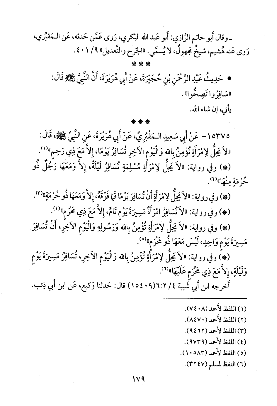 - وفي رواية: «لا يحل لامرأة تؤمن بالله ورسوله واليوم الآخر، أن تسافر مسيرة يوم واحد، ليس معها ذو مَحْرَم» (¬٥).