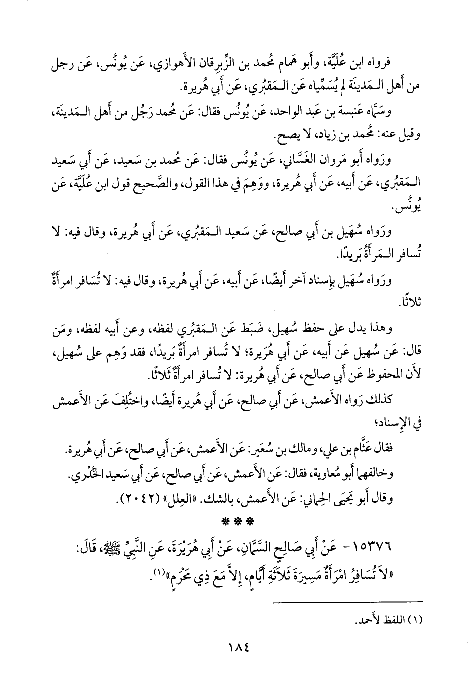 وهذا يدل على حفظ سهيل، ضبط عن المَقبُري لفظه، وعن أبيه لفظه، ومن قال: عن سهيل عن أبيه، عن أبي هريرة؛ لا تسافر امرأة بريدا، فقد وهم على سهيل، لأن المحفوظ عن أبي صالح، عن أبي هريرة: لا تسافر امرأة ثلاثا.