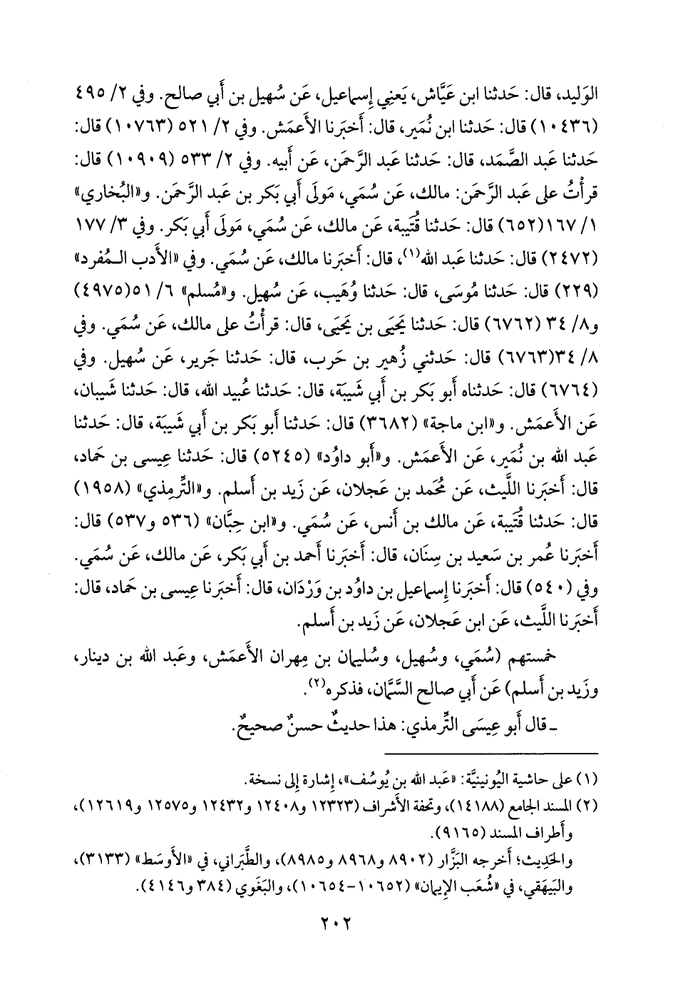 وفي ٨/ ٣٤ (٦٧٦٣) قال: حدثني زهير بن حرب، قال: حدثنا جرير، عن سهيل. وفي (٦٧٦٤) قال: حدثناه أَبو بكر بن أبي شيبة، قال: حدثنا عُبيد الله، قال: حدثنا شَيبان، عن الأعمش. و «ابن ماجة» (٣٦٨٢) قال: حدثنا أَبو بكر بن أبي شيبة، قال: حدثنا عبد الله بن نُمير، عن الأعمش. و «أَبو داود» (٥٢٤٥) قال: حدثنا عيسى بن حماد، قال: أخبرنا الليث، عن محمد بن عَجلان، عن زيد بن أسلم. و «التِّرمِذي» (١٩٥٨) قال: حدثنا قتيبة، عن مالك بن أنس، عن سمي. و «ابن حِبَّان» (٥٣٦ و ٥٣٧) قال: أخبرنا عمر بن سعيد بن سنان، قال: أخبرنا أحمد بن أَبي بكر، عن مالك، عن سمي. وفي (٥٤٠) قال: أخبرنا إسماعيل بن داود بن وَردان، قال: أخبرنا عيسى بن حماد، قال: أخبرنا الليث، عن ابن عَجلان، عن زيد بن أسلم.