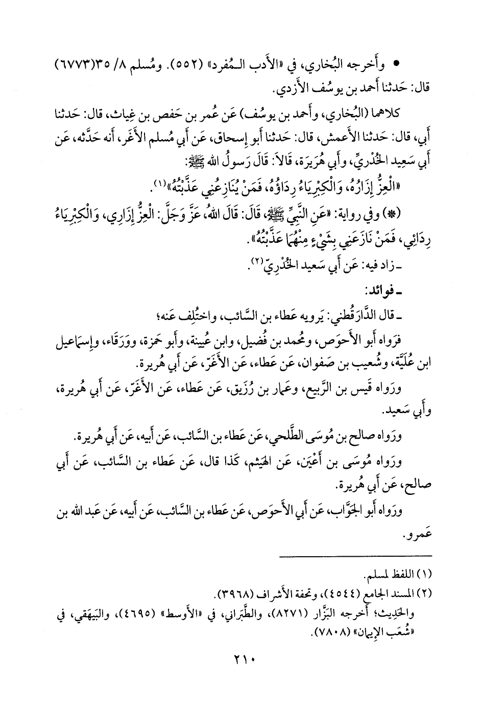- وفي رواية: «عن النبي صَلى الله عَليه وسَلم، قال: قال الله عز وجل: العز إزاري، والكبرياء ردائي، فمن نازعني بشيء منهما عذبته».