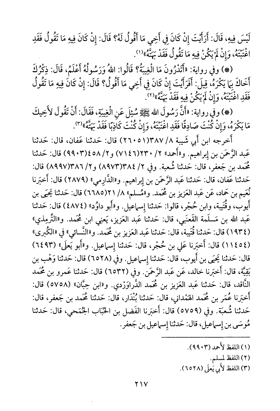 و «الدَّارِمي» (٢٨٧٩) قال: أخبرنا نُعيم بن حماد، عن عبد العزيز بن محمد. و «مسلم» ٨/ ٢١ (٦٦٨٥) قال: حدثنا يحيى بن أيوب، وقتيبة، وابن حجر، قالوا: حدثنا إسماعيل. و «أَبو داود» (٤٨٧٤) قال: حدثنا عبد الله بن مَسلَمة القَعنَبي، قال: حدثنا عبد العزيز، يعني ابن محمد. و «التِّرمِذي» (١٩٣٤) قال: حدثنا قتيبة، قال: حدثنا عبد العزيز بن محمد. و «النَّسَائي» في «الكبرى» (١١٤٥٤) قال: أخبرنا علي بن حُجْر، قال: حدثنا إسماعيل. و «أَبو يَعلى» (٦٤٩٣) قال: حدثنا يحيى بن أيوب، قال: حدثنا إسماعيل. وفي (٦٥٢٨) قال: حدثنا وهب بن بقية، قال: أخبرنا خالد، عن عبد الرَّحمَن. وفي (٦٥٣٢) قال: حدثنا عَمرو بن محمد الناقد، قال: حدثنا عبد العزيز بن محمد الدراوَرْدي. و «ابن حِبَّان» (٥٧٥٨) قال: أخبرنا عمر بن محمد الهمداني، قال: حدثنا بُندَار، قال: حدثنا محمد بن جعفر، قال: حدثنا شعبة. وفي (٥٧٥٩) قال: أخبرنا الفضل بن الحُبَاب الجُمحي، قال: حدثنا موسى بن إسماعيل، قال: حدثنا إسماعيل بن جعفر.