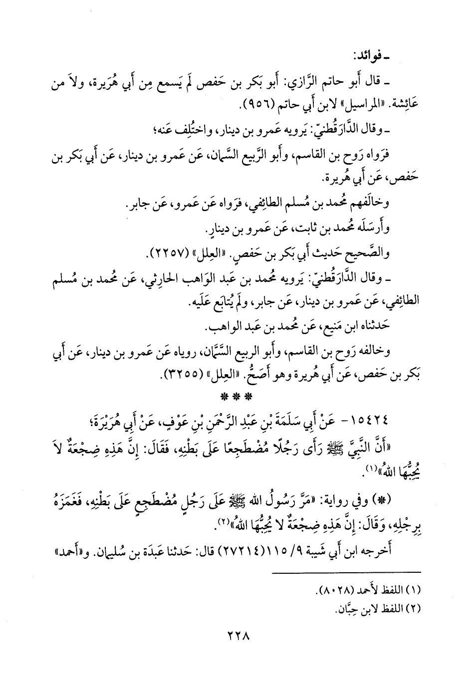 - وفي رواية: «مر رسول الله صَلى الله عَليه وسَلم على رجل مضطجع على بطنه، فغمزه برجله، وقال: إن هذه ضجعة لا يحبها الله» (¬٢).