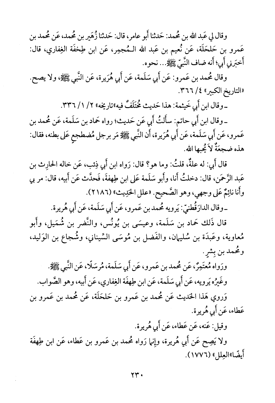 ـ وقال عبد الرَّحمَن بن أَبي حاتم الرازي: سأَلتُ أَبي عن حديثٍ؛ رواه حماد بن سلمة، عن محمد بن عَمرو، عن أَبي سلمة، عن أَبي هريرة، أَن النبي صَلى الله عَليه وسَلم مَر برجلٍ مُضطجع على بطنه، فقال: هذه ضِجعَةٌ لا يُحبها الله.