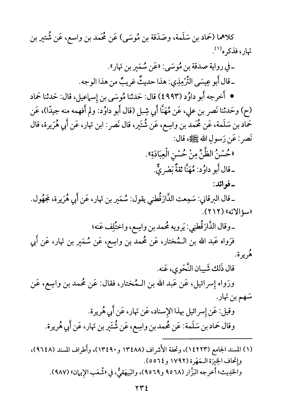 • أَخرجه أَبو داود (٤٩٩٣) قال: حدثنا موسى بن إسماعيل، قال: حدثنا حماد (ح) وحدثنا نصر بن علي، عن مُهَنَّا أبي شبل (قال أَبو داود: ولم أفهمه منه جيدا)، عن حماد بن سلمة، عن محمد بن واسع، عن شتير، قال نصر: ابن نهار، عن أبي هريرة، قال نصر: عن رسول الله صَلى الله عَليه وسَلم قال: