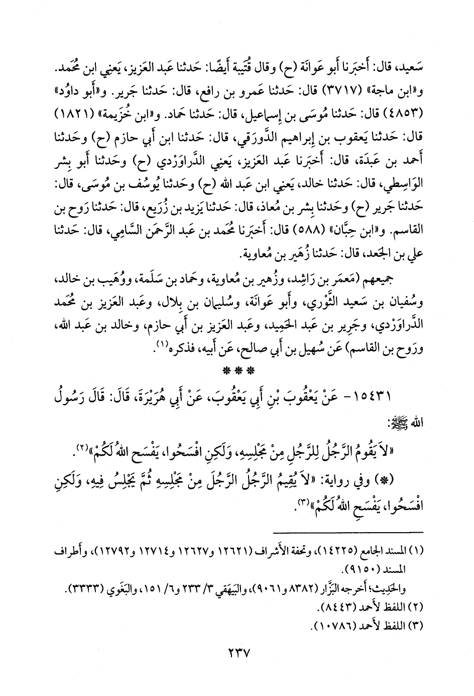 - وفي رواية: «لا يقيم الرجل الرجل من مجلسه ثم يجلس فيه، ولكن افسحوا، يفسح الله لكم» (¬٢).