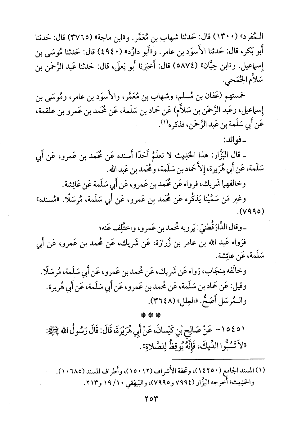 - قال البزار: هذا الحديث لا نعلم أحدًا أسنده عن محمد بن عَمرو، عن أبي سلمة، عن أبي هريرة، إلا حماد بن سلمة، ومحمد بن عبد الله.