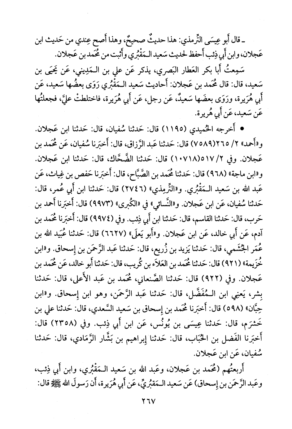 • أَخرجه الحُميدي (١١٩٥) قال: حدثنا سفيان، قال: حدثنا ابن عَجلان. و «أحمد» ٢/ ٢٦٥ (٧٥٨٩) قال: حدثنا عبد الرزاق، قال: أخبرنا سفيان، عن محمد بن عَجلان. وفي ٢/ ٥١٧ (١٠٧١٨) قال: حدثنا الضحاك، قال: حدثنا ابن عَجلان. و «ابن ماجة» (٩٦٨) قال: حدثنا محمد بن الصباح، قال: أخبرنا حفص بن غياث، عن عبد الله بن سعيد المَقبُري. و «التِّرمِذي» (٢٧٤٦) قال: حدثنا ابن أبي عمر، قال: حدثنا سفيان، عن ابن عَجلان. و «النَّسَائي» في «الكبرى» (٩٩٧٣) قال: أخبرنا أحمد بن حرب، قال: حدثنا القاسم، قال: حدثنا ابن أبي ذِئب. وفي (٩٩٧٤) قال: أخبرنا محمد بن آدم، عن أبي خالد، عن ابن عَجلان. و «أَبو يَعلى» (٦٦٢٧) قال: حدثنا عُبيد الله بن عمر الجشمي، قال: حدثنا يزيد بن زُريع، قال: حدثنا عبد الرَّحمَن بن إسحاق. و «ابن خزيمة» (٩٢١) قال: حدثنا محمد بن العلاء بن كُريب، قال: حدثنا أَبو خالد، عن محمد بن عَجلان. وفي (٩٢٢) قال: حدثنا الصَّنْعاني، محمد بن عبد الأعلى، قال: حدثنا بشر، يعني ابن المُفَضَّل، قال: حدثنا عبد الرَّحمَن، وهو ابن إسحاق. و «ابن حِبَّان» (٥٩٨) قال: أخبرنا محمد بن إسحاق بن سعيد السعدي، قال: حدثنا علي بن خشرم، قال: حدثنا عيسى بن يونس، عن ابن أبي ذِئب. وفي (٢٣٥٨) قال: أخبرنا الفضل بن الحُبَاب، قال: حدثنا إبراهيم بن بشار الرمادي، قال: حدثنا سفيان، عن ابن عَجلان.