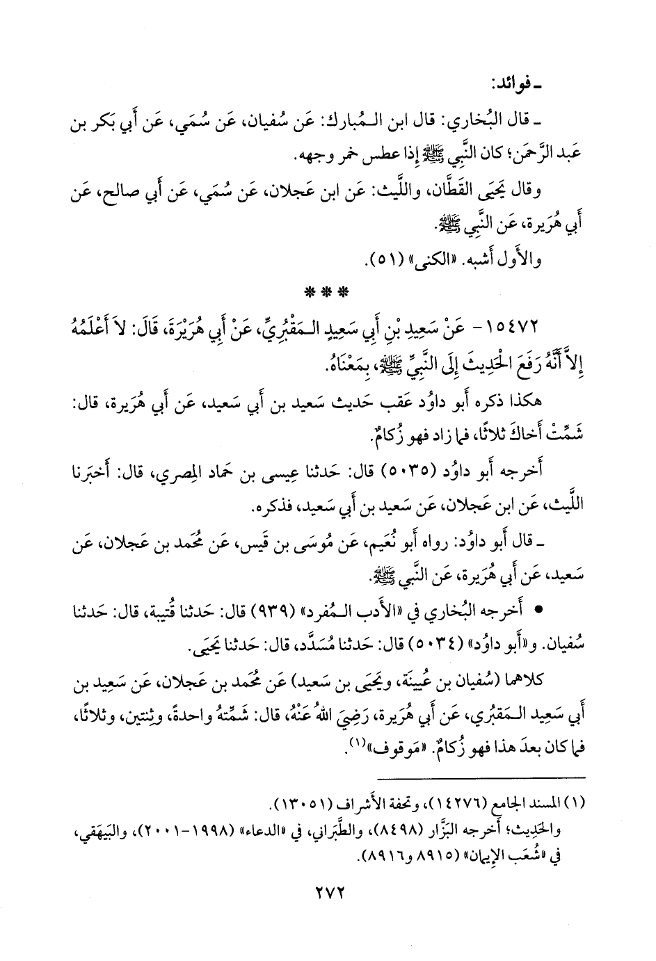 كلاهما (سفيان بن عُيينة، ويحيى بن سعيد) عن محمد بن عَجلان، عن سعيد بن أبي سعيد المَقبُري، عن أبي هريرة، رضي الله عنه, قال: شمته واحدة، وثنتين، وثلاثا، فما كان بعد هذا فهو زكام. «موقوف» (¬١).