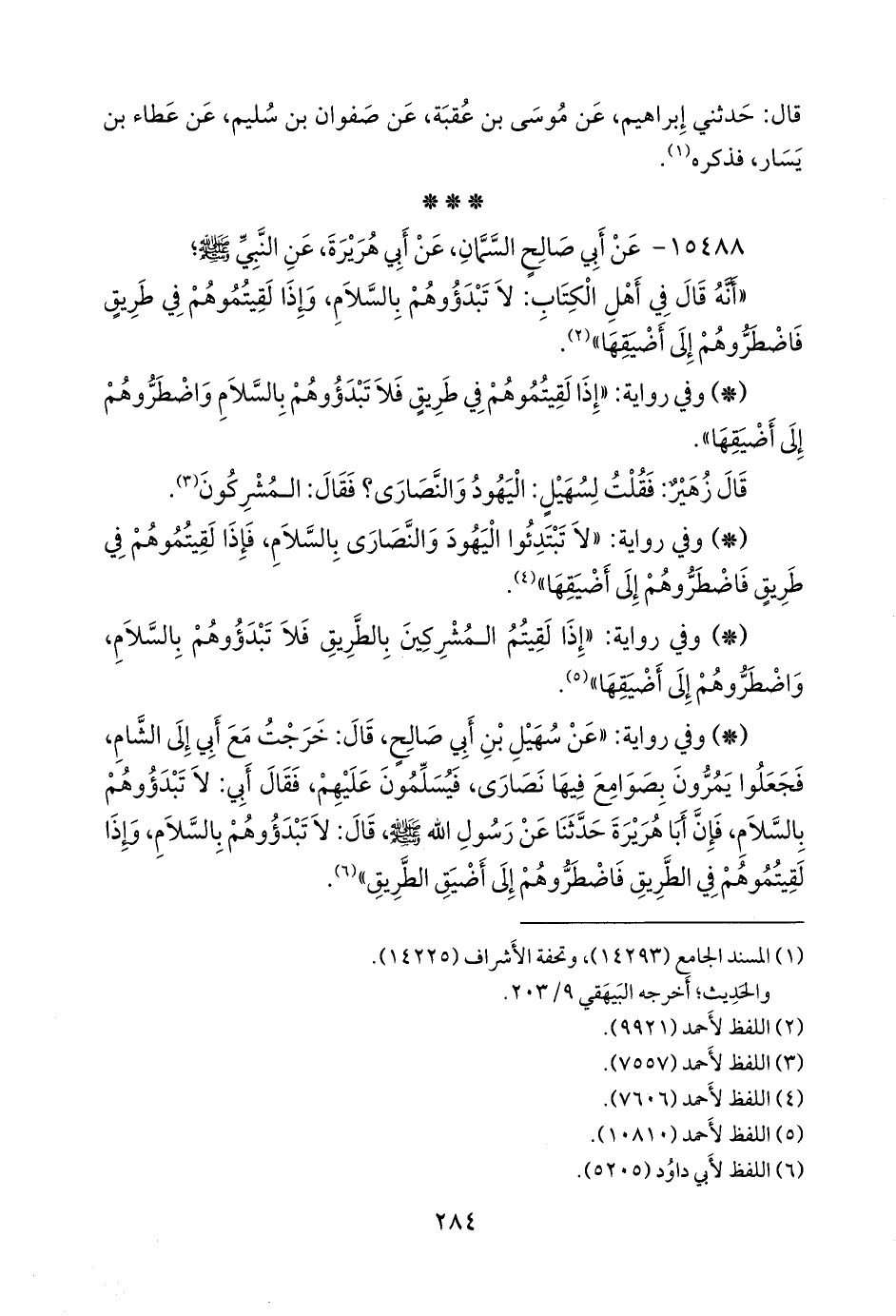 - وفي رواية: «لا تبتدئوا اليهود والنصارى بالسلام، فإذا لقيتموهم في طريق فاضطروهم إلى أضيقها» (¬٣).