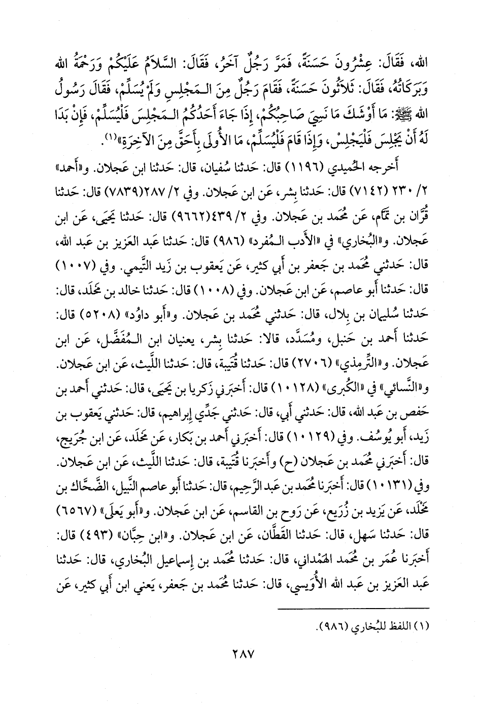 أخرجه الحُميدي (١١٩٦) قال: حدثنا سفيان، قال: حدثنا ابن عَجلان. و «أحمد» ٢/ ٢٣٠ (٧١٤٢) قال: حدثنا بشر، عن ابن عَجلان. وفي ٢/ ٢٨٧ (٧٨٣٩) قال: حدثنا قران بن تمام، عن محمد بن عَجلان. وفي ٢/ ٤٣٩ (٩٦٦٢) قال: حدثنا يحيى، عن ابن عَجلان. و «البخاري» في «الأدب المفرد» (٩٨٦) قال: حدثنا عبد العزيز بن عبد الله، قال: حدثني محمد بن جعفر بن أبي كثير، عن يعقوب بن زيد التيمي. وفي (١٠٠٧) قال: حدثنا أَبو عاصم، عن ابن عَجلان. وفي (١٠٠٨) قال: حدثنا خالد بن مخلد، قال: حدثنا سليمان بن بلال، قال: حدثني محمد بن عَجلان. و «أَبو داود» (٥٢٠٨) قال: حدثنا أحمد بن حنبل، ومُسَدَّد، قالا: حدثنا بشر، يعنيان ابن المُفَضَّل، عن ابن عَجلان. و «التِّرمِذي» (٢٧٠٦) قال: حدثنا قتيبة، قال: حدثنا الليث، عن ابن عَجلان. و «النَّسَائي» في «الكبرى» (١٠١٢٨) قال: أخبرني زكريا بن يحيى، قال: حدثني أحمد بن حفص بن عبد الله، قال: حدثني أبي، قال: حدثني جدي إبراهيم، قال: حدثني يعقوب بن زيد، أَبو يوسف. وفي (١٠١٢٩) قال: أخبرني أحمد بن بكار، عن مخلد، عن ابن جُريج، قال: أخبرني محمد بن عَجلان (ح) وأخبرنا قتيبة، قال: حدثنا الليث، عن ابن عَجلان. وفي (١٠١٣١) قال: أخبرنا محمد بن عبد الرحيم، قال: حدثنا أَبو عاصم النبيل الضحاك بن مخلد، عن يزيد بن زُريع، عن روح بن القاسم، عن ابن عَجلان. و «أَبو يَعلى» (٦٥٦٧) قال: حدثنا سهل، قال: حدثنا القطان، عن ابن عَجلان. و «ابن حِبَّان» (٤٩٣) قال: أخبرنا عمر بن محمد الهمداني، قال: حدثنا محمد بن إسماعيل البخاري، قال: حدثنا عبد العزيز بن عبد الله الأويسي، قال: حدثنا محمد بن جعفر، يعني ابن أبي كثير، عن