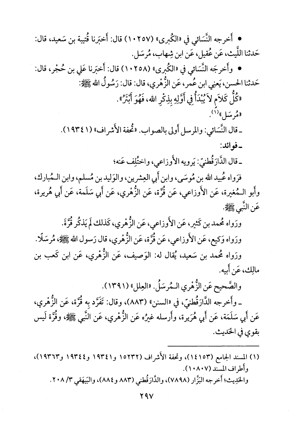 فرواه عُبيد الله بن موسى، وابن أَبي العشرين، والوليد بن مسلم، وابن المبارك، وأَبو المغيرة، عن الأَوزاعي، عن قُرة، عن الزُّهْري، عن أَبي سلمة، عن أَبي هريرة، عن النبي صَلى الله عَليه وسَلم.