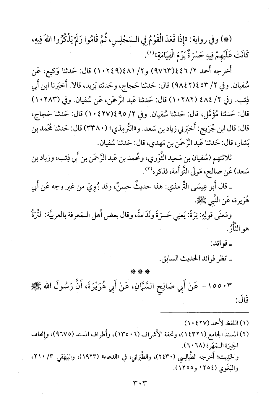 - وفي رواية: «ما اجتمع قوم في مجلس، فتفرقوا من غير ذكر الله، والصلاة على النبي صَلى الله عَليه وسَلم إلا كان عليهم حسرة يوم القيامة» (¬٤).
