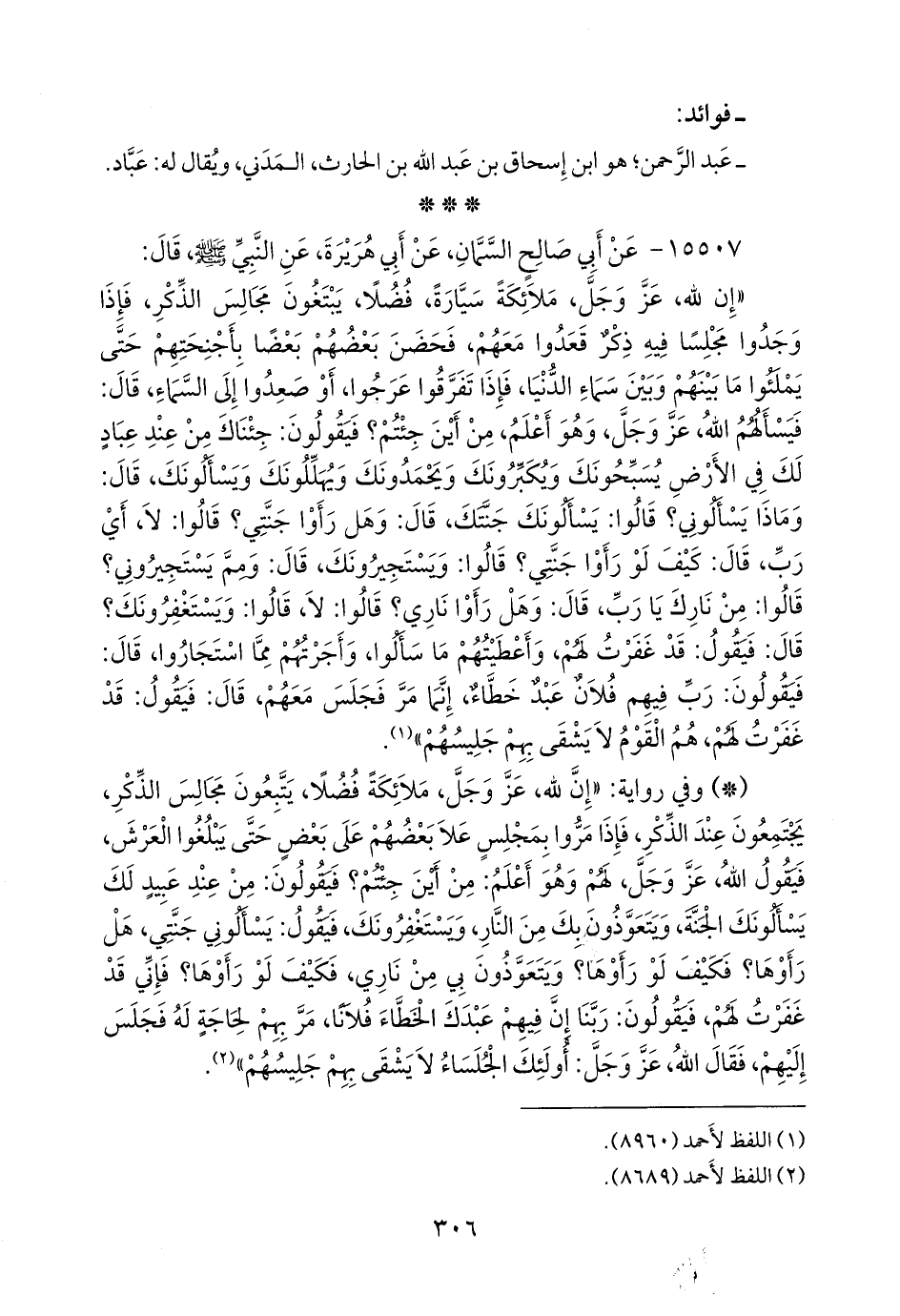- وفي رواية: «إن لله، عز وجل، ملائكة فضلا، يتبعون مجالس الذكر، يجتمعون عند الذكر، فإذا مروا بمجلس علا بعضهم على بعض حتى يبلغوا العرش، فيقول الله، عز وجل، لهم وهو أعلم: من أين جئتم؟ فيقولون: من عند عبيد لك يسألونك الجنة، ويتعوذون بك من النار، ويستغفرونك، فيقول: يسألوني جنتي، هل رأوها؟ فكيف لو رأوها؟ ويتعوذون بي من ناري، فكيف لو رأوها؟ فإني قد غفرت لهم، فيقولون: ربنا إن فيهم عبدك الخطاء فلانا، مر بهم لحاجة له فجلس إليهم، فقال الله، عز وجل: أولئك الجلساء لا يشقى بهم جليسهم» (¬٢).