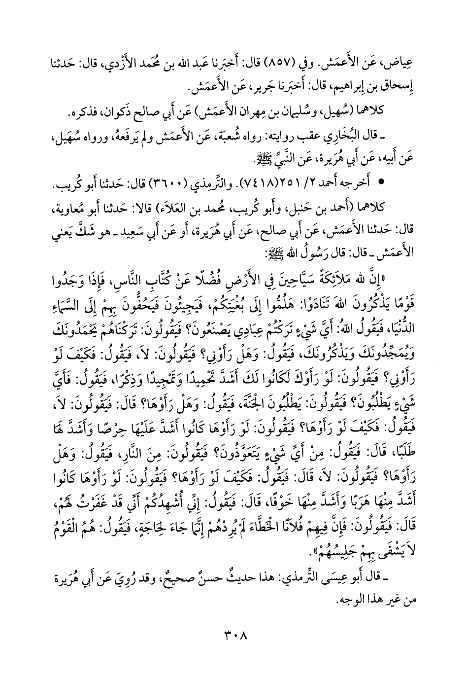 «إن لله ملائكة سياحين في الأرض فضلا عن كتاب الناس، فإذا وجدوا قوما يذكرون الله تنادوا: هلموا إلى بغيتكم، فيجيئون فيحفون بهم إلى السماء الدنيا، فيقول الله: أي شيء تركتم عبادي يصنعون؟ فيقولون: تركناهم يحمدونك ويمجدونك ويذكرونك، فيقول: وهل رأوني؟ فيقولون: لا، فيقول: فكيف لو رأوني؟ فيقولون: لو رأوك لكانوا لك أشد تحميدا وتمجيدا وذكرا، فيقول: فأي شيء يطلبون؟ فيقولون: يطلبون الجنة، فيقول: وهل رأوها؟ قال: فيقولون: لا، فيقول: فكيف لو رأوها؟ فيقولون: لو رأوها كانوا أشد عليها حرصا وأشد لها طلبا، قال: فيقول: من أي شيء يتعوذون؟ فيقولون: من النار، فيقول: وهل رأوها؟ فيقولون: لا، قال: فيقول: فكيف لو رأوها؟ فيقولون: لو رأوها كانوا أشد منها هربا وأشد منها خوفا، قال: فيقول: إني أشهدكم أني قد غفرت لهم، قال: فيقولون: فإن فيهم فلانا الخطاء لم يردهم إنما جاء لحاجة، فيقول: هم القوم لا يشقى بهم جليسهم».