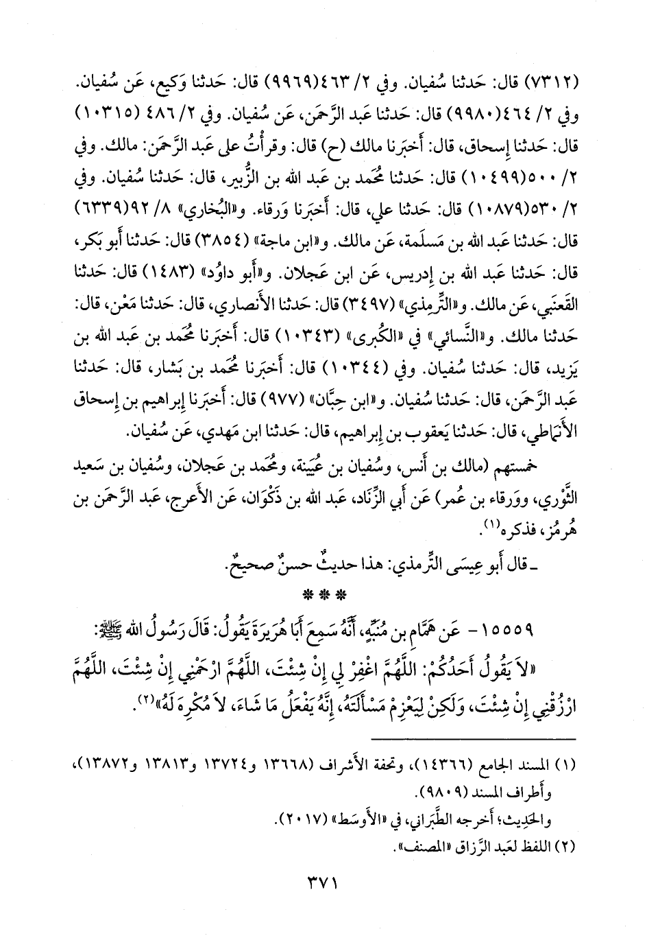 و «البخاري» ٨/ ٩٢ (٦٣٣٩) قال: حدثنا عبد الله بن مَسلَمة، عن مالك. و «ابن ماجة» (٣٨٥٤) قال: حدثنا أَبو بكر، قال: حدثنا عبد الله بن إدريس، عن ابن عَجلان. و «أَبو داود» (١٤٨٣) قال: حدثنا القَعنَبي، عن مالك. و «التِّرمِذي» (٣٤٩٧) قال: حدثنا الأَنصاري، قال: حدثنا مَعْن، قال: حدثنا مالك. و «النَّسَائي» في «الكبرى» (١٠٣٤٣) قال: أخبرنا محمد بن عبد الله بن يزيد، قال: حدثنا سفيان. وفي (١٠٣٤٤) قال: أخبرنا محمد بن بشار، قال: حدثنا عبد الرَّحمَن، قال: حدثنا سفيان. و «ابن حِبَّان» (٩٧٧) قال: أخبرنا إبراهيم بن إسحاق الأنماطي، قال: حدثنا يعقوب بن إبراهيم، قال: حدثنا ابن مهدي، عن سفيان.