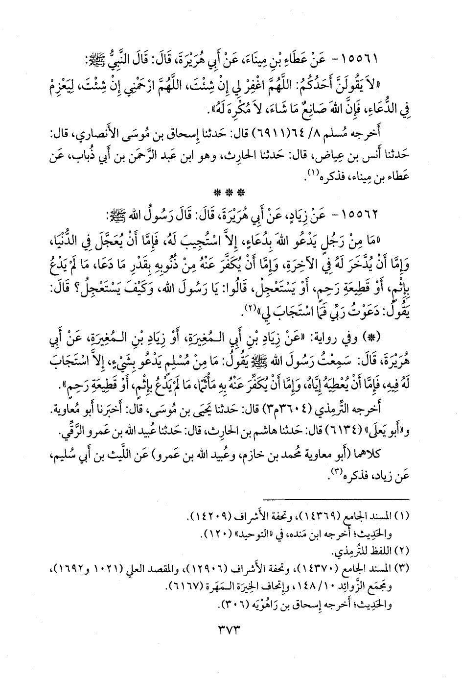 - وفي رواية: «عن زياد بن أبي المغيرة، أو زياد بن المغيرة، عن أبي هريرة، قال: سمعت رسول الله صَلى الله عَليه وسَلم يقول: ما من مسلم يدعو بشيء، إلا استجاب له فيه، فإما أن يعطيه إياه، وإما أن يكفر عنه به ماثما، ما لم يدع بإثم، أو قطيعة رحم».