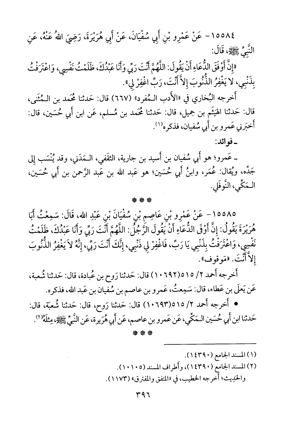 ١٥٥٨٥ - عن عَمرو بن عاصم بن سفيان بن عبد الله، قال: سمعت أبا هريرة يقول: إن أوفى الدعاء أن يقول الرجل: اللهم أنت ربي وأنا عبدك، ظلمت نفسي، واعترفت بذنبي يا رب، فاغفر لي ذنبي، إنك أنت ربي، إنه لا يغفر الذنوب إلا أنت. «موقوف».