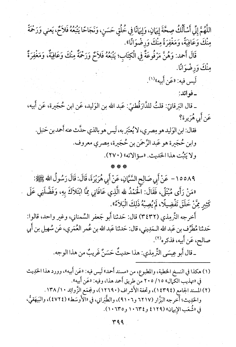 «من رأى مبتلى، فقال: الحمد لله الذي عافاني مما ابتلاك به، وفضلني على كثير ممن خلق تفضيلا، لم يصبه ذلك البلاء».