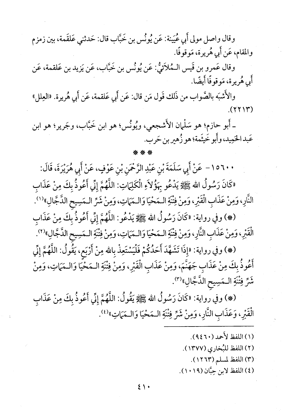 - وفي رواية: «إذا تشهد أحدكم فليستعذ بالله من أربع، يقول: اللهم إني أعوذ بك من عذاب جهنم، ومن عذاب القبر، ومن فتنة المحيا والممات، ومن شر فتنة المسيح الدجال» (¬٣).