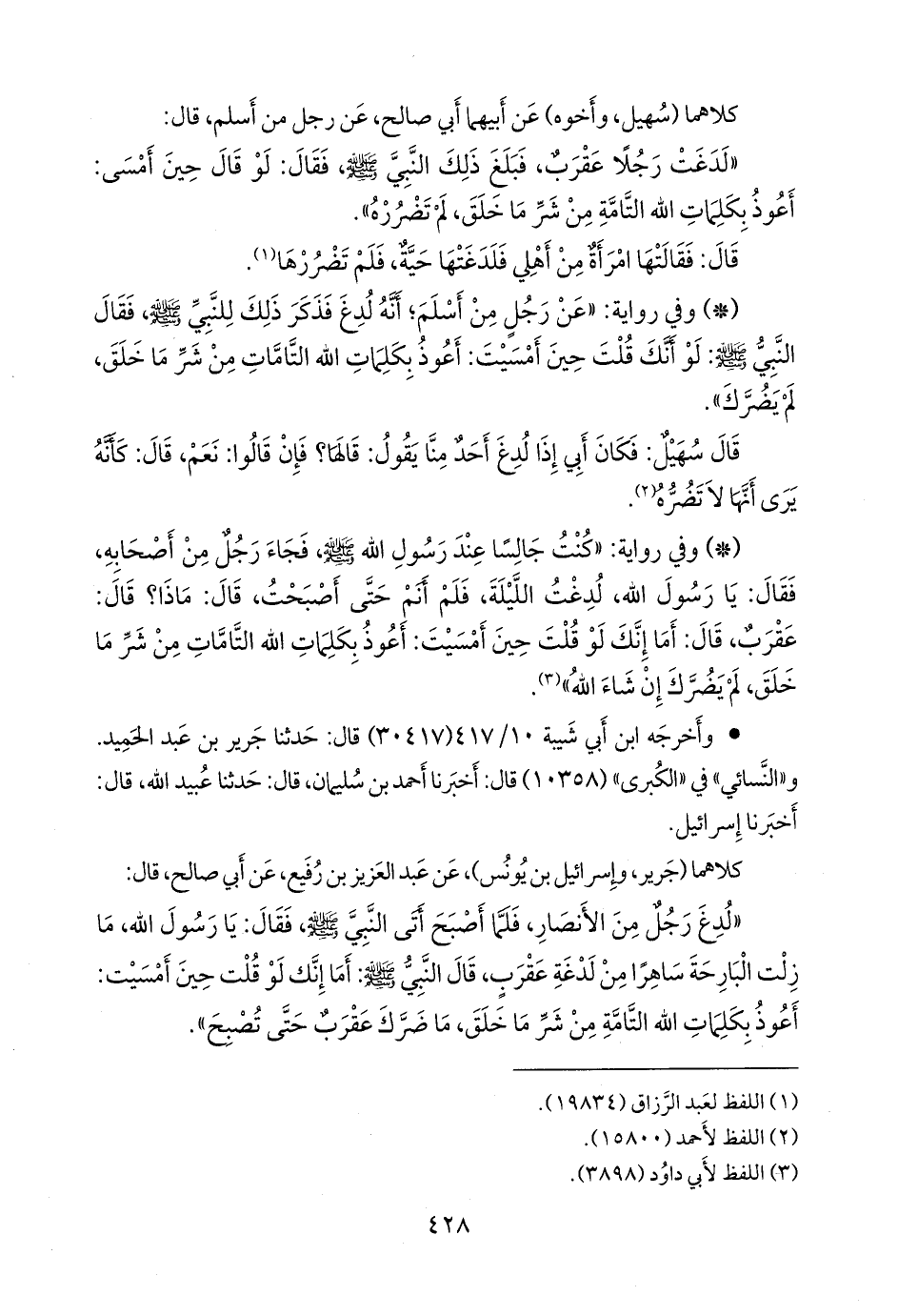 «لدغ رجل من الأنصار، فلما أصبح أتى النبي صَلى الله عَليه وسَلم فقال: يا رسول الله، ما زلت البارحة ساهرا من لدغة عقرب، قال النبي صَلى الله عَليه وسَلم: أما إنك لو قلت حين أمسيت: أعوذ بكلمات الله التامة من شر ما خلق، ما ضرك عقرب حتى تصبح».