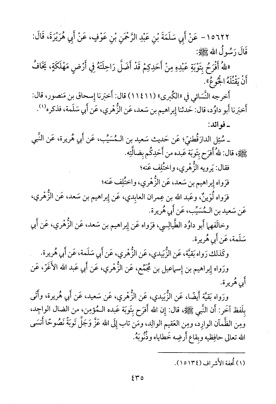 - سئل الدارقُطني؛ عن حديث سعيد بن المُسَيب، عن أبي هريرة، عن النبي صَلى الله عَليه وسَلم قال: لله أفرح بتوبة عبده من أحدكم بضالته.