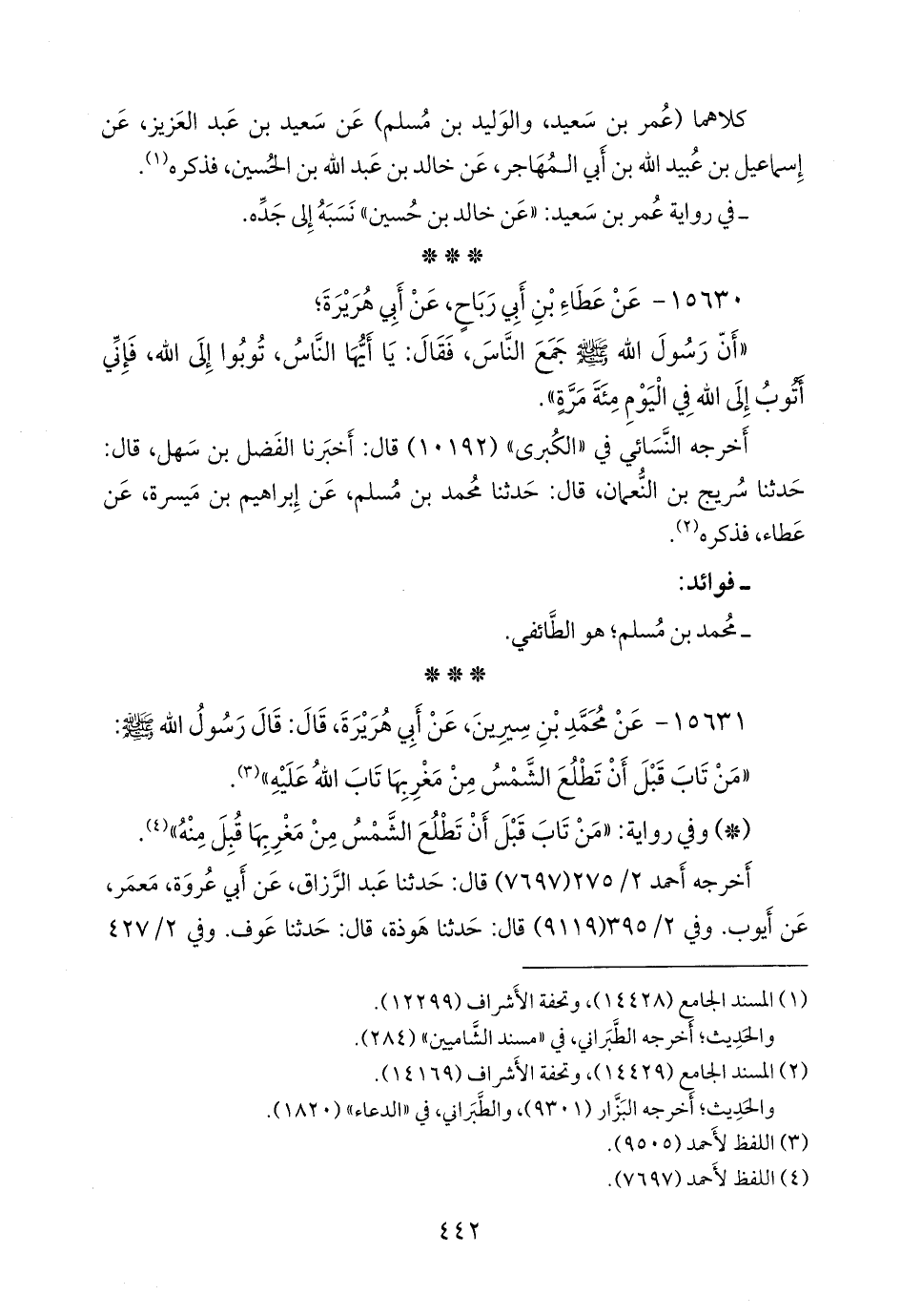 (¬٣) المسند الجامع (١٤٤٣٢)، وتحفة الأشراف (١٤٤٩١ و ١٤٥١١ و ١٤٥١٨ و ١٤٥٧٠ و ١٤٥٧٤)، وأطراف المسند (١٠٢٢٦)، ومَجمَع الزوائد ١٠/ ١٩٨.