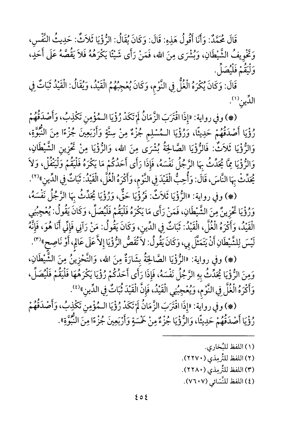 - وفي رواية: «الرؤيا ثلاث: فرؤيا حق، ورؤيا يحدث بها الرجل نفسه، ورؤيا تحزين من الشيطان، فمن رأى ما يكره فليقم فليصل، وكان يقول: يعجبني القيد، وأكره الغل، القيد: ثبات في الدين، وكان يقول: من رآني فإني أنا هو، فإنه ليس للشيطان أن يتمثل بي، وكان يقول: لا تقص الرؤيا إلا على عالم، أو ناصح» (¬٣).