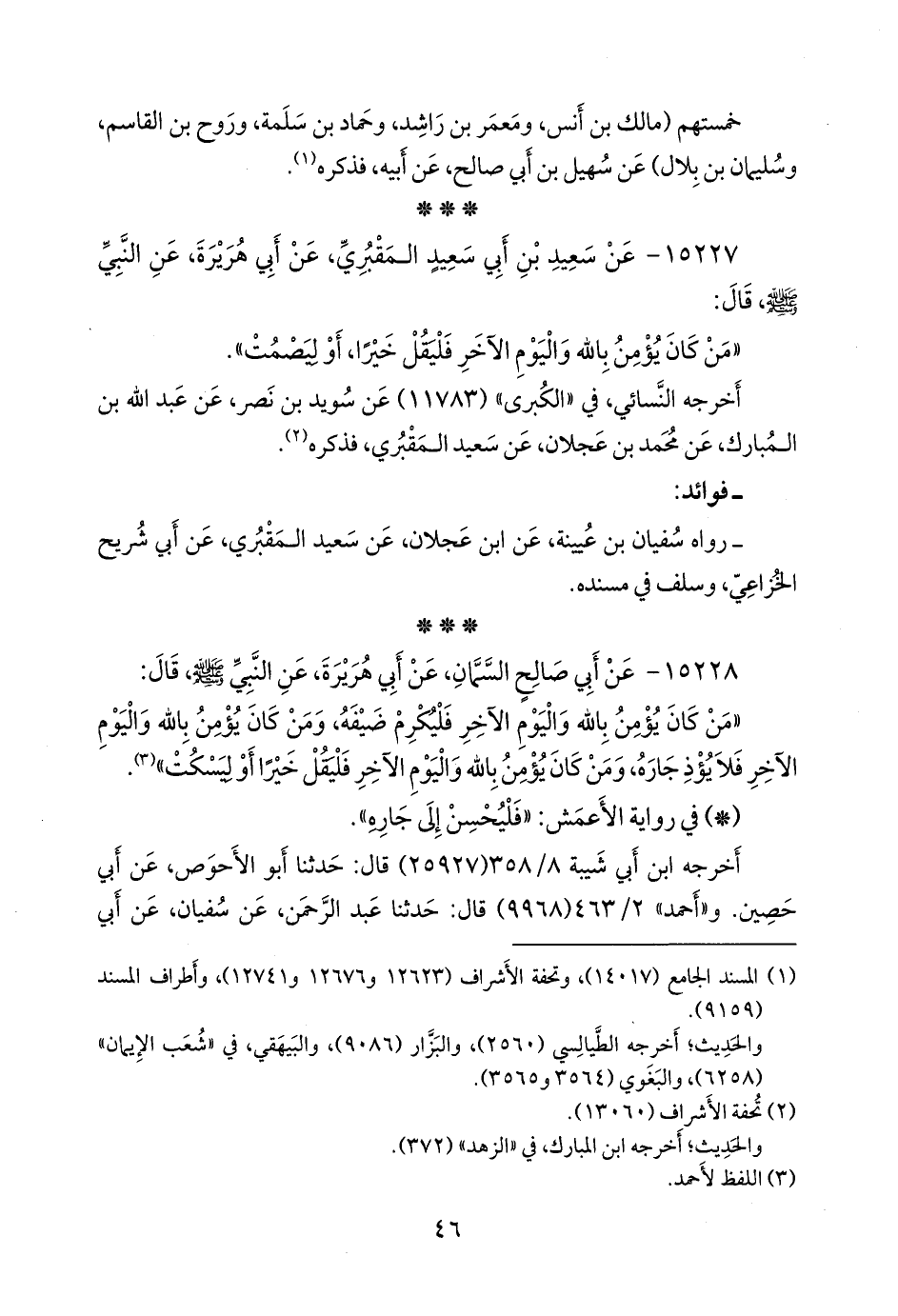 «من كان يؤمن بالله واليوم الآخر فليكرم ضيفه، ومن كان يؤمن بالله واليوم الآخر فلا يؤذ جاره، ومن كان يؤمن بالله واليوم الآخر فليقل خيرًا أو ليسكت» (¬١).
