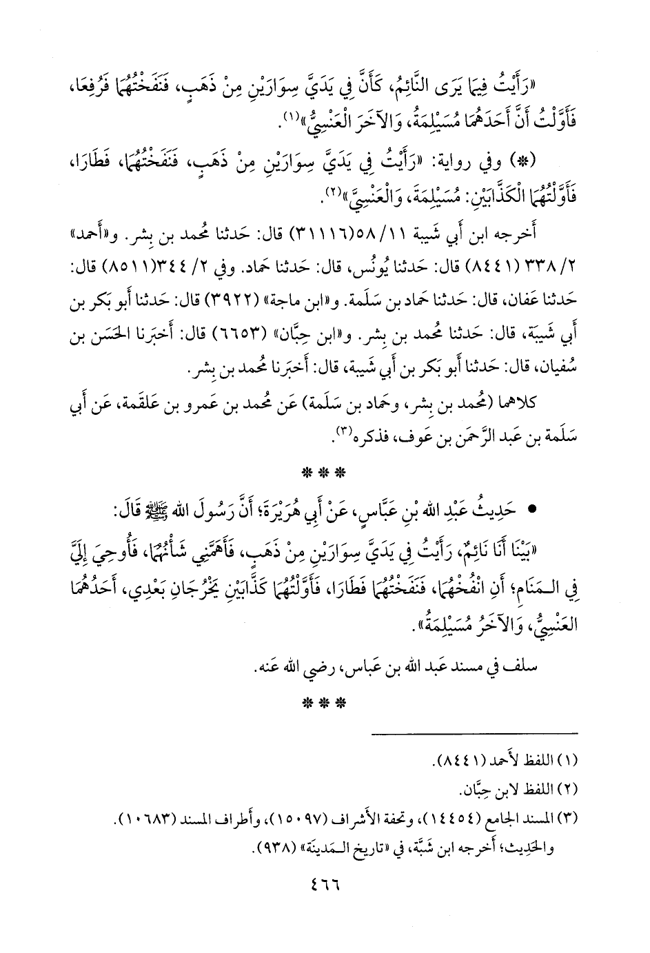 «بينا أنا نائم، رأيت في يدي سوارين من ذهب، فأهمني شانهما، فأوحي إلي في المنام؛ أن انفخهما، فنفختهما فطارا، فأولتهما كذابين يخرجان بعدي، أحدهما العنسي، والآخر مسيلمة».