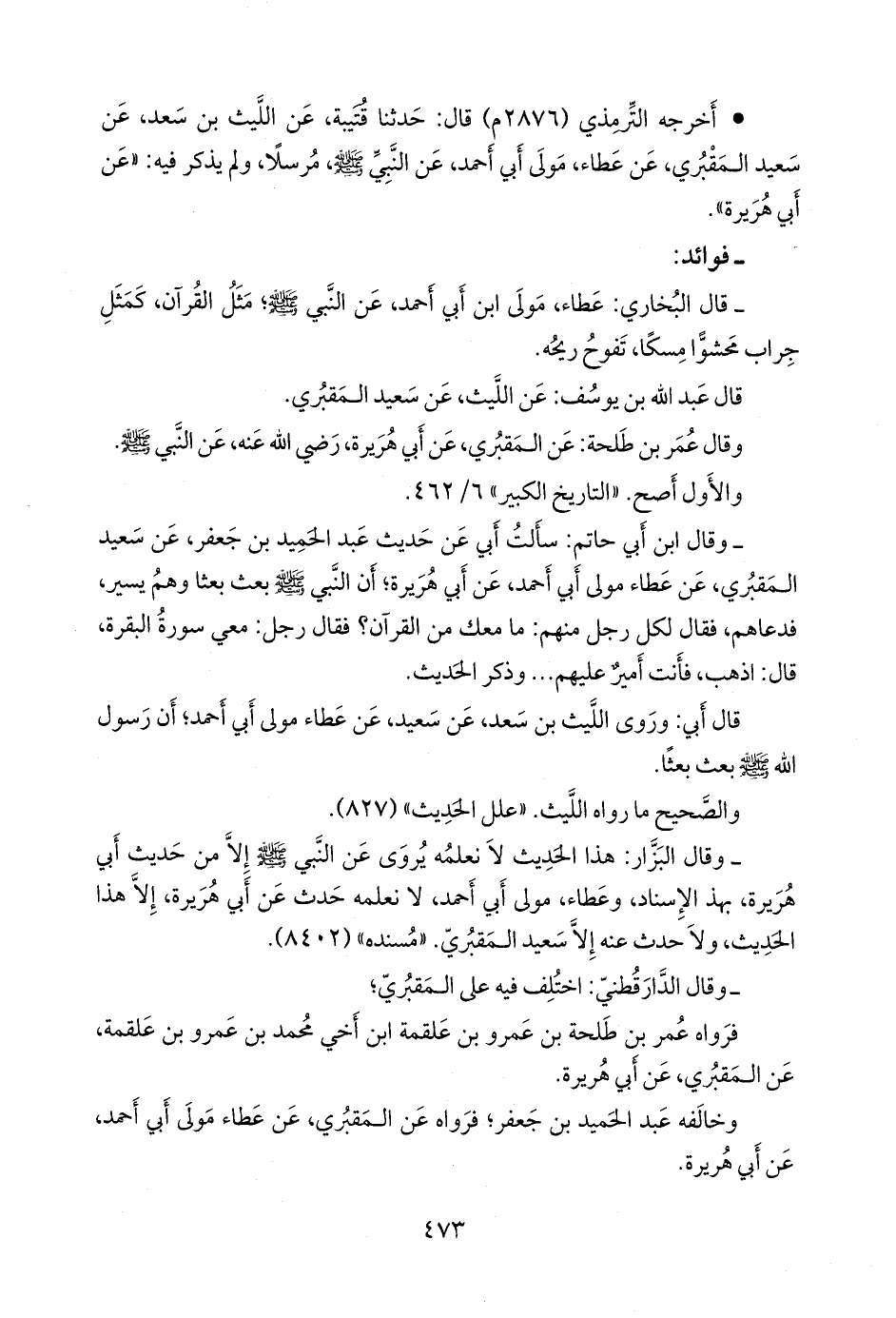 - وقال ابن أبي حاتم: سألت أبي عن حديث عبد الحميد بن جعفر، عن سعيد المَقبُري، عن عطاء مولى أبي أحمد، عن أبي هريرة؛ أن النبي صَلى الله عَليه وسَلم بعث بعثا وهم يسير، فدعاهم، فقال لكل رجل منهم: ما معك من القرآن؟ فقال رجل: معي سورة البقرة، قال: اذهب، فأنت أمير عليهم ... وذكر الحديث.