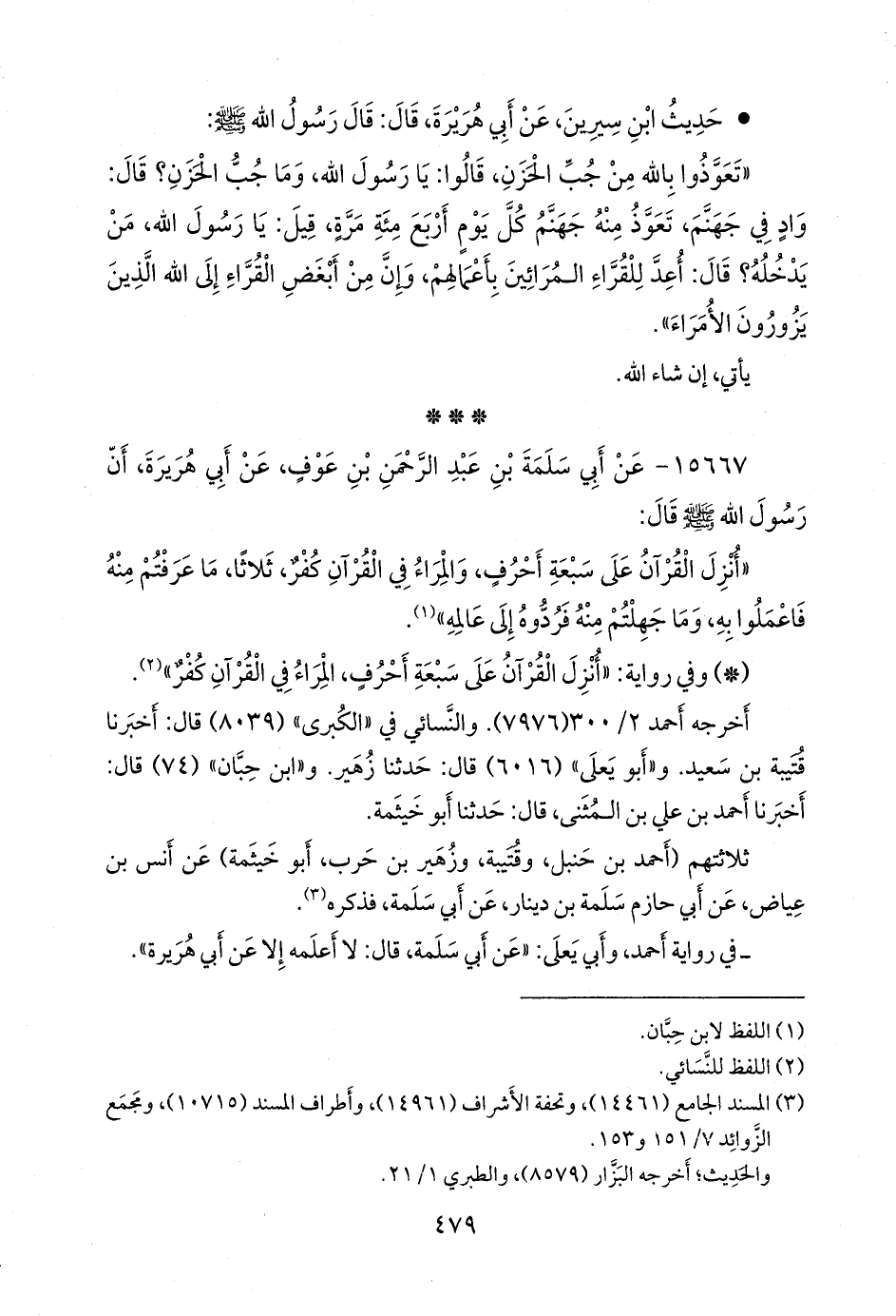 (¬٣) المسند الجامع (١٤٤٦١)، وتحفة الأشراف (١٤٩٦١)، وأطراف المسند (١٠٧١٥)، ومَجمَع الزوائد ٧/ ١٥١ و ١٥٣.