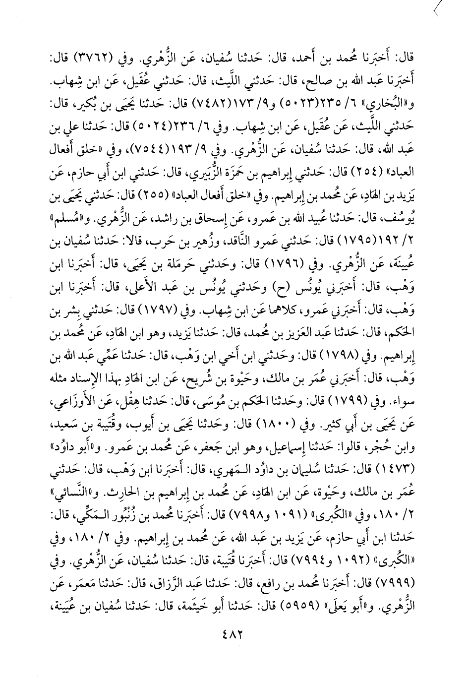 وفي ٩/ ١٩٣ (٧٥٤٤)، وفي «خلق أفعال العباد» (٢٥٤) قال: حدثني إبراهيم بن حمزة الزُّبَيري، قال: حدثني ابن أبي حازم، عن يزيد بن الهاد، عن محمد بن إبراهيم. وفي «خلق أفعال العباد» (٢٥٥) قال: حدثني يحيى بن يوسف، قال: حدثنا عُبيد الله بن عَمرو، عن إسحاق بن راشد، عن الزُّهْري. و «مسلم» ٢/ ١٩٢ (١٧٩٥) قال: حدثني عَمرو الناقد، وزهير بن حرب، قالا: حدثنا سفيان بن عُيينة، عن الزُّهْري. وفي (١٧٩٦) قال: وحدثني حَرملة بن يحيى، قال: أخبرنا ابن وهب، قال: أخبرني يونس (ح) وحدثني يونس بن عبد الأعلى، قال: أخبرنا ابن وهب، قال: أخبرني عَمرو، كلاهما عن ابن شهاب. وفي (١٧٩٧) قال: حدثني بشر بن الحكم، قال: حدثنا عبد العزيز بن محمد، قال: حدثنا يزيد، وهو ابن الهاد، عن محمد بن إبراهيم. وفي (١٧٩٨) قال: وحدثني ابن أخي ابن وهب، قال: حدثنا عمي عبد الله بن وهب، قال: أخبرني عمر بن مالك، وحَيْوَة بن شُرَيح، عن ابن الهاد بهذا الإسناد مثله سواء. وفي (١٧٩٩) قال: وحدثنا الحكم بن موسى، قال: حدثنا هقل، عن الأوزاعي، عن يحيى بن أبي كثير. وفي (١٨٠٠) قال: وحدثنا يحيى بن أيوب، وقتيبة بن سعيد، وابن حجر، قالوا: حدثنا إسماعيل، وهو ابن جعفر، عن محمد بن عَمرو. و «أَبو داود» (١٤٧٣) قال: حدثنا سليمان بن داود المهري، قال: أخبرنا ابن وهب، قال: حدثني عمر بن مالك، وحيوة، عن ابن الهاد، عن محمد بن إبراهيم بن الحارث. و «النَّسَائي» ٢/ ١٨٠، وفي «الكبرى» (١٠٩١ و ٧٩٩٨) قال: أخبرنا محمد بن زنبور المكي، قال: حدثنا ابن أبي حازم، عن يزيد بن عبد الله، عن محمد بن إبراهيم. وفي ٢/ ١٨٠، وفي «الكبرى» (١٠٩٢ و ٧٩٩٤) قال: أخبرنا قتيبة، قال: حدثنا سفيان، عن الزُّهْري. وفي (٧٩٩٩) قال: أخبرنا محمد بن رافع، قال: حدثنا عبد الرزاق، قال: حدثنا مَعمَر، عن الزُّهْري. و «أَبو يَعلى» (٥٩٥٩) قال: حدثنا أَبو خيثمة، قال: حدثنا سفيان بن عُيينة،