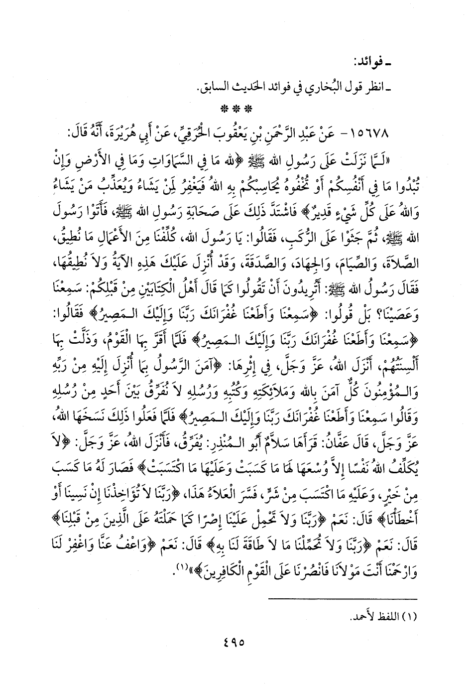 «لما نزلت على رسول الله صَلى الله عَليه وسَلم {لله ما في السماوات وما في الأرض وإن تبدوا ما في أنفسكم أو تخفوه يحاسبكم به الله فيغفر لمن يشاء ويعذب من يشاء والله على كل شيء قدير} فاشتد ذلك على صحابة رسول الله صَلى الله عَليه وسَلم فأتوا رسول الله صَلى الله عَليه وسَلم ثم جثوا على الركب، فقالوا: يا رسول الله، كلفنا من الأعمال ما نطيق، الصلاة، والصيام، والجهاد، والصدقة، وقد أنزل عليك هذه الآية ولا نطيقها، فقال رسول الله صَلى الله عَليه وسَلم: أتريدون أن تقولوا كما قال أهل الكتابين من قبلكم: سمعنا وعصينا؟ بل قولوا: {سمعنا وأطعنا غفرانك ربنا وإليك المصير} فقالوا: {سمعنا وأطعنا غفرانك ربنا وإليك المصير} فلما أقر بها القوم، وذلت بها ألسنتهم، أنزل الله، عز وجل، في إثرها: {آمن الرسول بما أنزل إليه من ربه والمؤمنون كل آمن بالله وملائكته وكتبه ورسله لا نفرق بين أحد من رسله وقالوا سمعنا وأطعنا غفرانك ربنا وإليك المصير} فلما فعلوا ذلك نسخها الله، عز وجل، قال عفان: قرأها سلام أَبو المنذر: يفرق, فأنزل الله، عز وجل: {لا يكلف الله نفسا إلا وسعها لها ما كسبت وعليها ما اكتسبت} فصار له ما كسب من خير، وعليه ما اكتسب من شر،