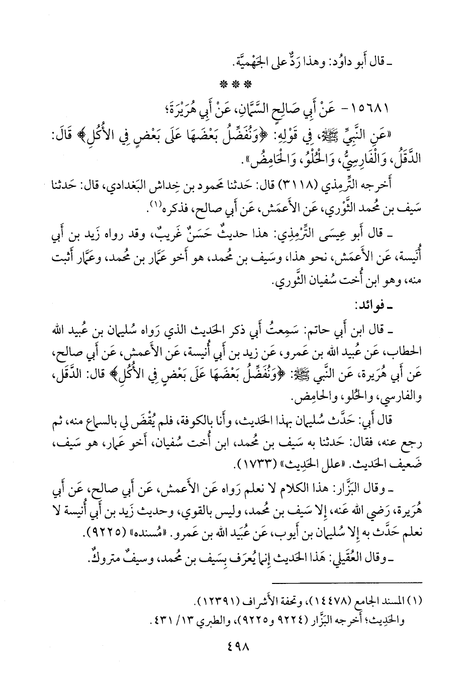 - قال عبد الرَّحمَن بن أبي حاتم الرازي: سمعت أبي ذكر الحديث الذي رواه سليمان بن عُبيد الله الحطاب، عن عُبيد الله بن عَمرو، عن زيد بن أَبي أُنيسة، عن الأعمش، عن أبي صالح، عن أبي هريرة، عن النبي صَلى الله عَليه وسَلم: {ونفضل بعضها على بعض في الأكل} قال: الدقل، والفارسي، والحلو، والحامض.