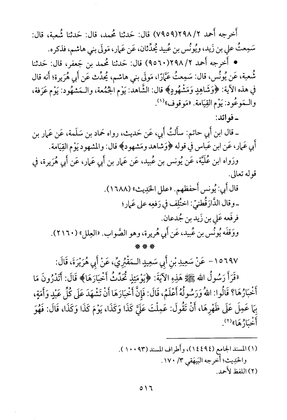 - قال عبد الرَّحمَن بن أبي حاتم الرازي: سألت أبي، عن حديث، رواه حماد بن سلمة، عن عمار بن أبي عمار، عن ابن عباس في قوله {وشاهد ومشهود} قال: والمشهود يوم القيامة.