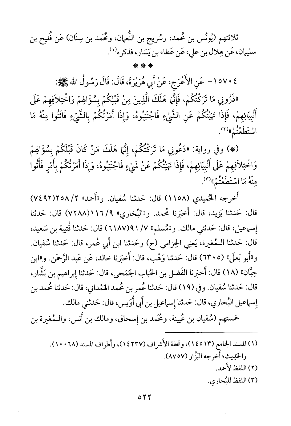 - وفي رواية: «دعوني ما تركتكم، إنما هلك من كان قبلكم بسؤالهم واختلافهم على أنبيائهم، فإذا نهيتكم عن شيء فاجتنبوه، وإذا أمرتكم بأمر فاتوا منه ما استطعتم» (¬٢).