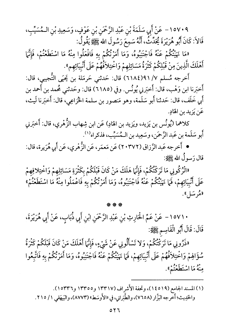 «اتركوني ما تركتكم، فإنما هلك من كان قبلكم بكثرة مسائلهم واختلافهم على أنبيائهم، فما نهيتكم عنه فاجتنبوه، وما أمرتكم به فاعملوا منه ما استطعتم»» مرسل».