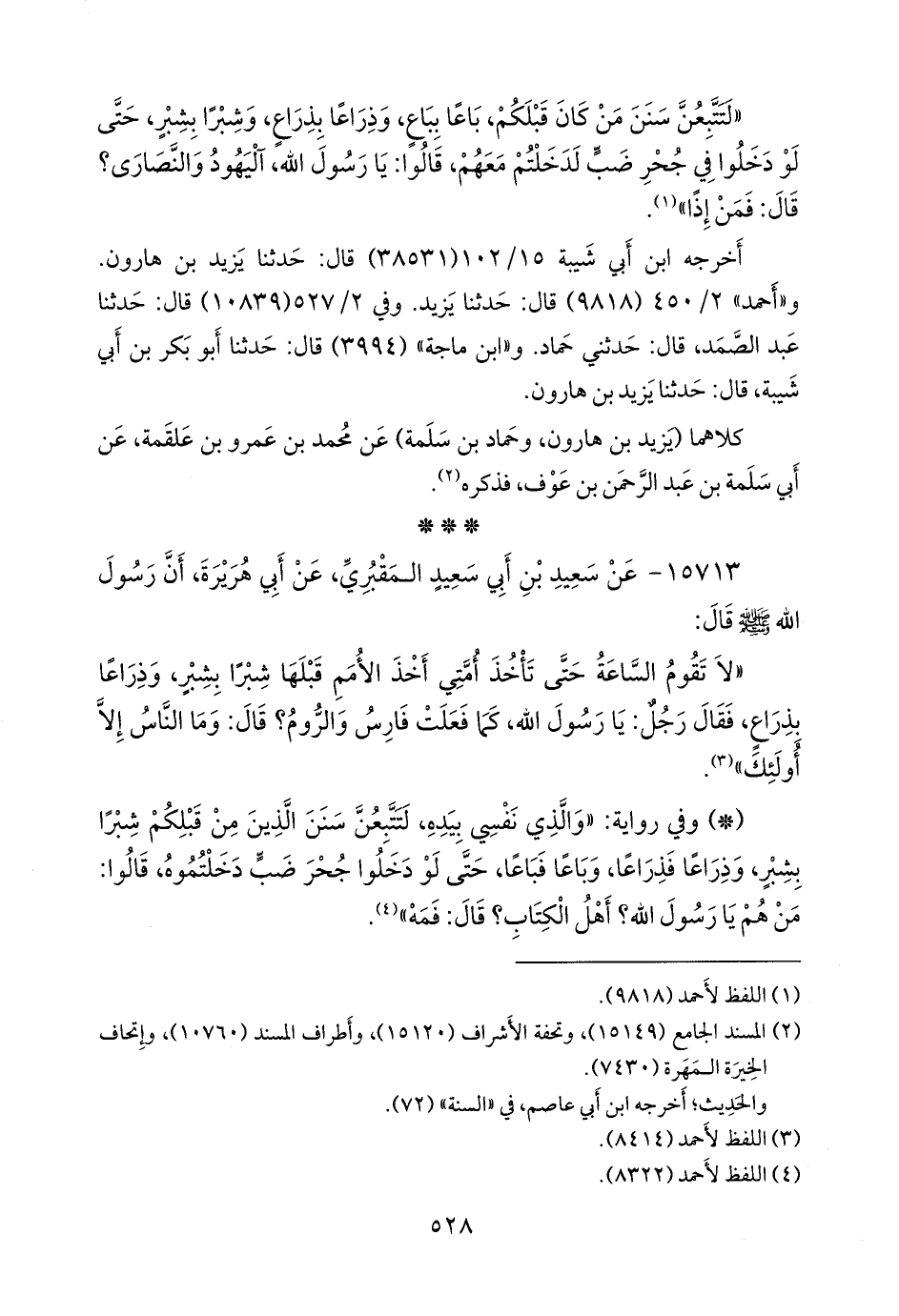 - وفي رواية: «والذي نفسي بيده، لتتبعن سنن الذين من قبلكم شبرا بشبر، وذراعا فذراعا، وباعا فباعا، حتى لو دخلوا جحر ضب دخلتموه، قالوا: من هم يا رسول الله؟ أهل الكتاب؟ قال: فمه» (¬٢).