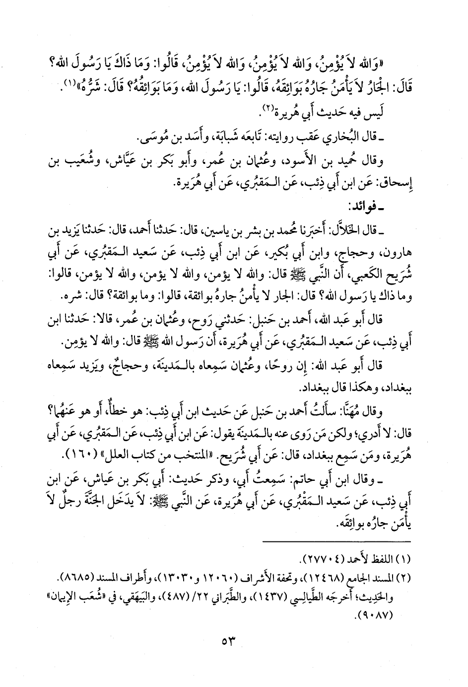 - قال الخلال: أخبرنا محمد بن بشر بن ياسين، قال: حدثنا أحمد، قال: حدثنا يزيد بن هارون، وحجاج، وابن أبي بكير، عن ابن أبي ذِئب، عن سعيد المَقبُري، عن أبي شريح الكعبي، أن النبي صَلى الله عَليه وسَلم قال: والله لا يؤمن، والله لا يؤمن، والله لا يؤمن، قالوا: وما ذاك يا رسول الله؟ قال: الجار لا يامن جاره بوائقة، قالوا: وما بوائقة؟ قال: شره.