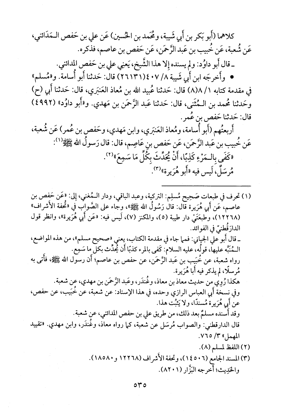 - قال أَبو علي الجياني: فمما جاء في مقدمة الكتاب، يعني «صحيح مسلم»، من هذه المواضع، المنبه عليها، قوله، عليه السلام: كفى بالمرء كذبا أن يحدث بكل ما سمع, رواه شعبة، عن خبيب بن عبد الرَّحمَن، عن حفص بن عاصم؛ أن رسول الله صَلى الله عَليه وسَلم فأتى به مرسلا، لم يذكر فيه أبا هريرة, هكذا روي من حديث معاذ بن معاذ، وغُندَر، وعبد الرَّحمَن بن مهدي، عن شعبة, وفي نسخة أبي العباس الرازي وحده، في هذا الإسناد: عن شعبة، عن خبيب، عن حفص، عن أبي هريرة مسندا، ولا يثبت هذا, وقد أسنده مسلم بعد ذلك، من طريق علي بن حفص المدائني، عن شعبة, قال الدارقُطني: والصواب مرسل عن شعبة، كما رواه معاذ، وغُندَر، وابن مهدي. «تقييد المهمل» ٣/ ٧٦٥.