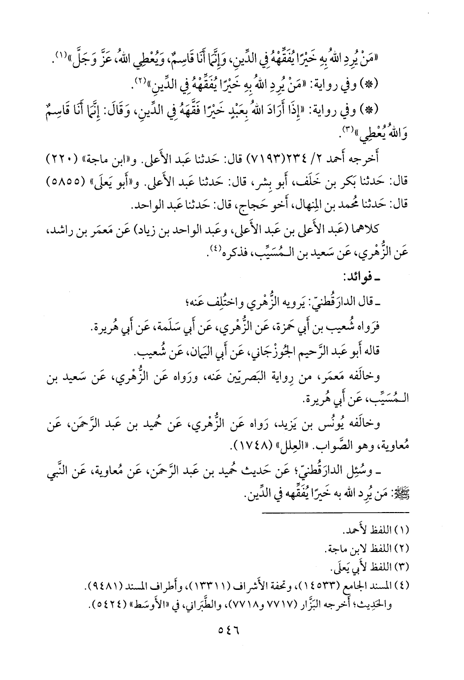 - وسئل الدارقُطني؛ عن حديث حميد بن عبد الرَّحمَن، عن معاوية، عن النبي صَلى الله عَليه وسَلم: من يرد الله به خيرًا يفقهه في الدين.