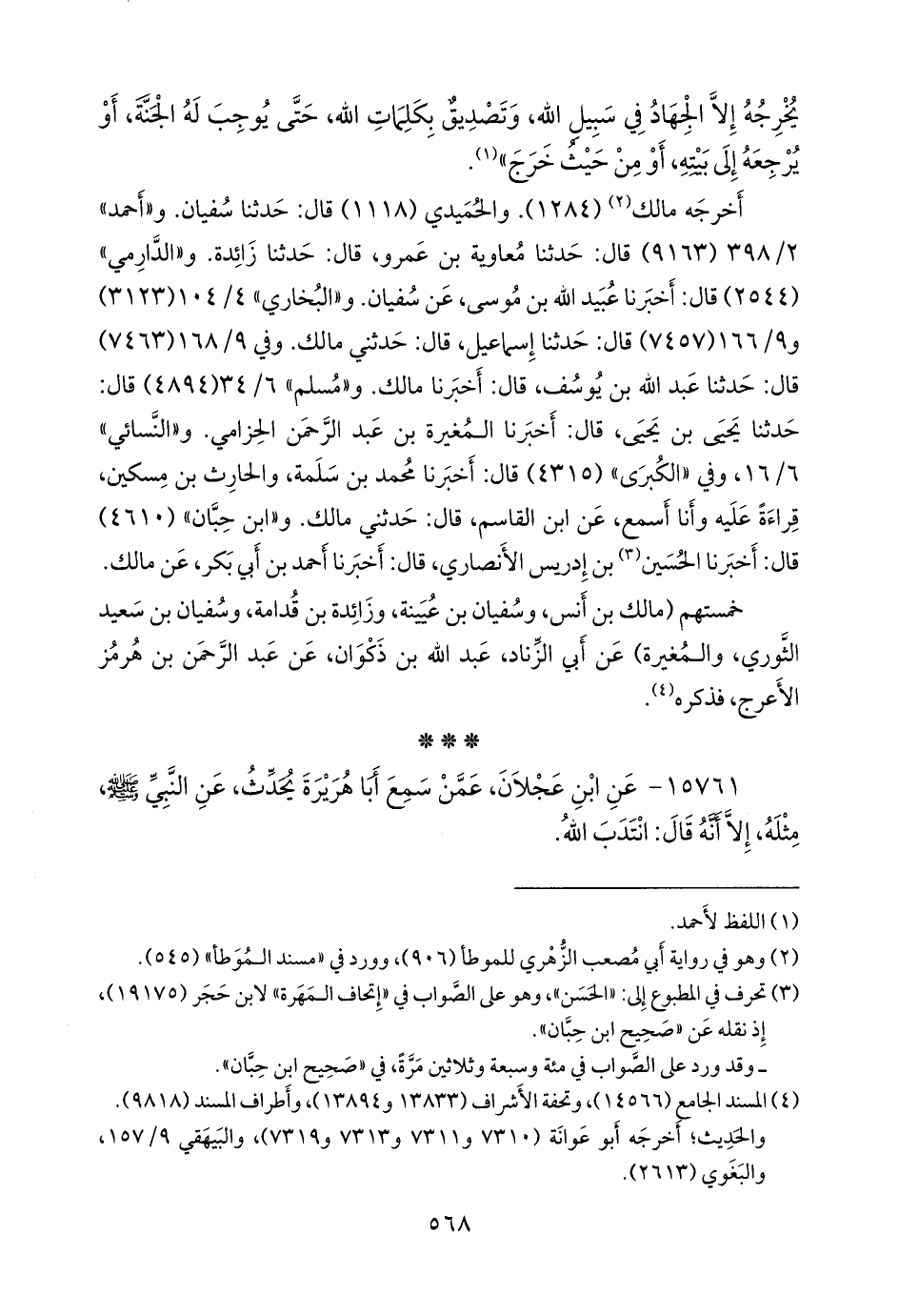 (¬٢) المسند الجامع (١٤٥٦٦)، وتحفة الأشراف (١٣٨٣٣ و ١٣٨٩٤)، وأطراف المسند (٩٨١٨).